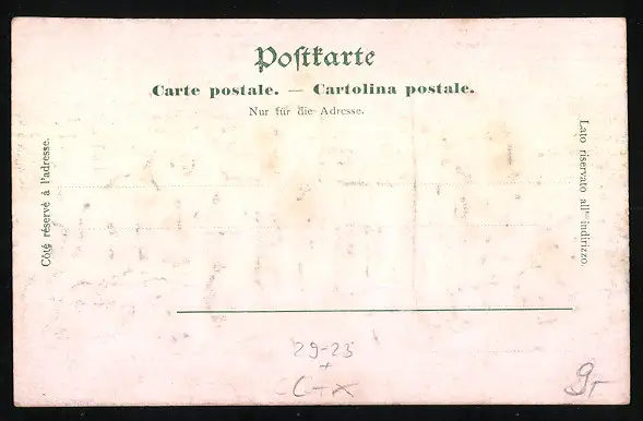 Personenbezogene Daten auf der Rückseite der Karte wurden durch blauen Textmarker unkenntlich gemacht. Die blauen Stellen sind auf die Vorderseite durchgeweicht und wirken sich negativ auf das Postkartenfoto aus