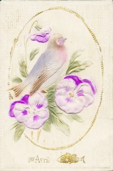 Relief Ak Glückwunsch 1. April, Vogel, Stiefmütterchen, Fisch