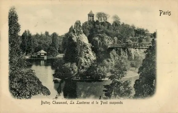 Relief Ak Paris XIX. Buttes Chaumont, La Lanterne, Hängebrücke