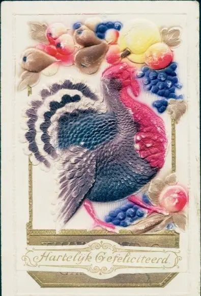 Relief Ak Thanksgiving, Truthahn und Obst, Birnen, Weintrauben