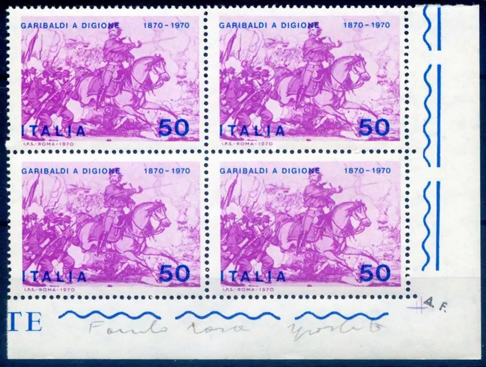 Republik. Garibaldi. 50 Lire lila rosa Sorte nach rechts verschoben. Viertelblattwinkel; Angebot als Einzelstücke. Briefmarken Anonyme Briefmarken Mailand. Sassone spec. 2016: 748Aa (**) - 160,00 Euro.