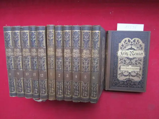 Einband gering berieben und bestoßen, papierbedingt leicht gebräunt, vereinzelt stockfleckig, sonst sauber und fest. Gute Exemplare. INHALT: Bd. 1: Plattdeutsche Gedichte heiteren Inhalts in mecklenburgisch-vorpommerscher Mundart. Läuschen und Rimels I. Theil. XVI, 269 S., 1888. / Bd. 2: Läuschen und Rimels II. Theil. 259 S. / Bd. 3: Poetische Erzählungen in niederdeutscher Mundart. De Reis` nach Belligen. XVIII, 294 S. / Bd. 4: Olle Kamellen I. Theil. Zwei lustige Geschichten. Franzosentid. 304 S. mit 1 Titelbild. / Bd. 5: Olle Kamellen II. Theil. Ud mine Festungstid. 350 S. / Bd. 6: Schurr-Murr. 305 S. / Bd. 8: Olle Kamellen III / Ut mine Stromtid. 1. Theil. 340 S. / Bd. 9: Olle Kamellen IV / Ut mine Stromtid. 2. Theil. 324 S. / Bd. 10: Olle Kamellen V / Ut mine Stromtid. 3. Theil. 374 S. / Bd. 11: Kein Hüsung. 222 S. / Bd. 12: Olle Kamellen VI / Dörchläuchting. 327 S. / Bd. 13: Olle Kamellen VII / De mecklnbörg`schen Montecchi un Capuletti oder De Reis nah Konstantinopel. 378 S.