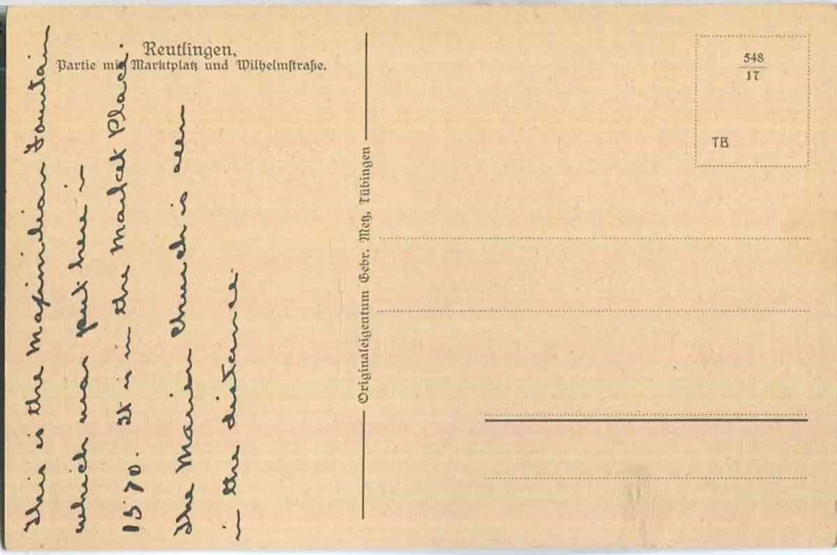 Reutlingen - Marktplatz und Wilhelmstrasse - Strassenbahn - Verlag Gebr. Metz Tübingen 20er Jahre