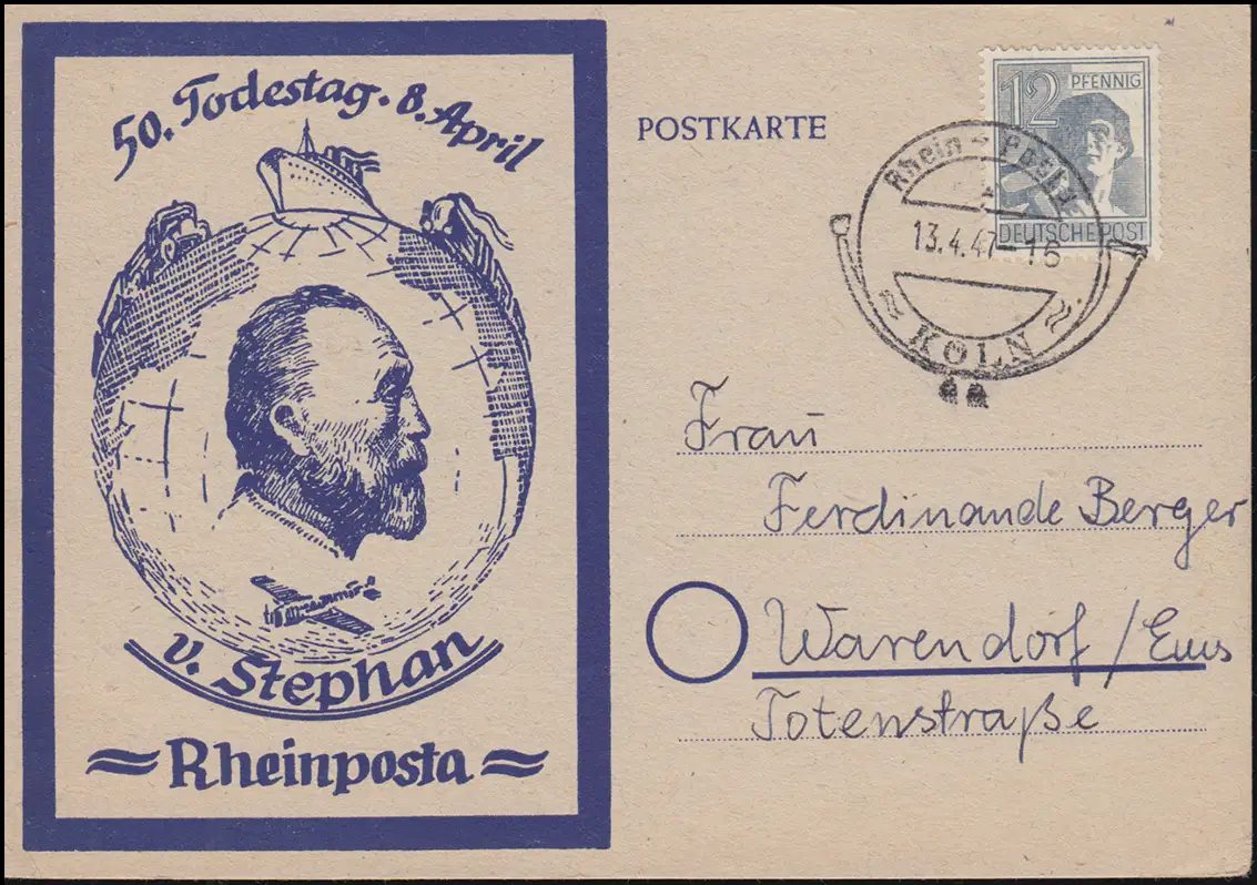 Rheinposta 50. Todestag H. von Stephan SSt KÖLN Rhein-Posta 13.4.47