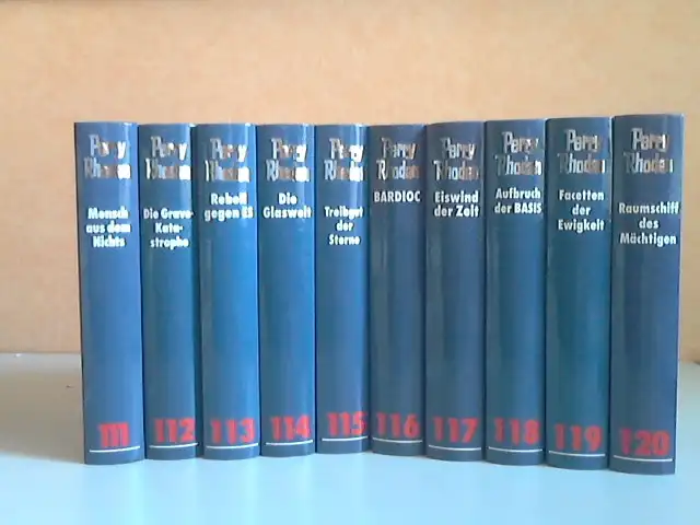 alle 10 Bücher stammen aus einer Haushaltsauflösung, Seiten leicht fleckig, guter Allgemeinzustand, ... Im Herbst des Jahres 3583 erwacht in einer verlassenen Relaisstation des ehemaligen Solaren Imperiums ein geheimnisvoller Mann. ... Mit dem Generationenraumschiff SOL haben Perry Rhodan und der Arkonide Atlan die nahezu entvölkerte Erde erreicht, die es in eine unbekannte Galaxis verschlagen hat. ... Anfang des Jahres 3584: Der Widerstand in der Milchstraße wächst - immer mehr Völker arbeiten gegen die Laren und die von ihnen als Statthalter eingesetzten Überschweren. ... Das Jahr 3586: Seit ein Notruf der Superintelligenz ES eintraf, warten neue Herausforderungen auf die Menschheit. ... Im Jahr 3586: Schon sehr lange warten die Trümmerleute, die sich selbst Loower nennen. auf einen sechsdimensionalen Impuls, der sie auf die Spur eines geheimnisvollen Objekts führen soll. ... Im Jahr 3586 n. Chr. ist die PAN-THAU-RA zu einer ungeahnten Bedrohung für viele Galaxien und ihre Bewohner geworden. .... (von den Einbänden) 3n4b Antiquariat Ardelt