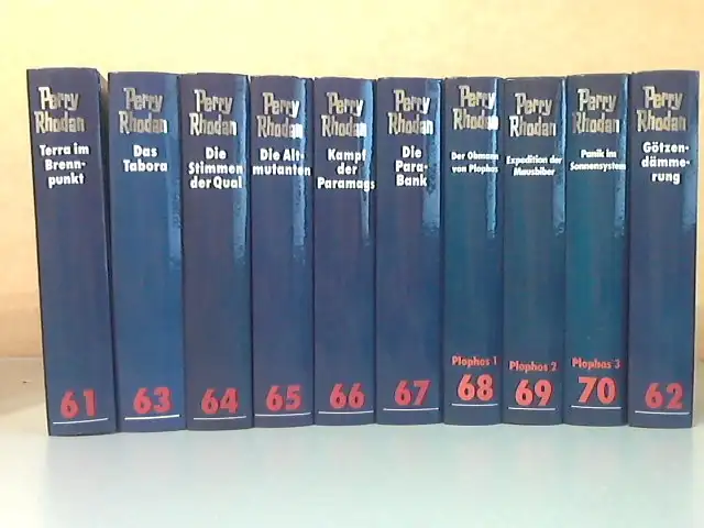Terra im Brennpunkt + Das Tabora + Die Stimmen der Qual + Die Altmutanten + Kampf der Paramags + Die Para-Bank + Der Obermann von Plophos + Expedition der Mausbiber + Panik im Sonnensystem + Götzendämmerung 10 Bände: Band 61 bis 70
