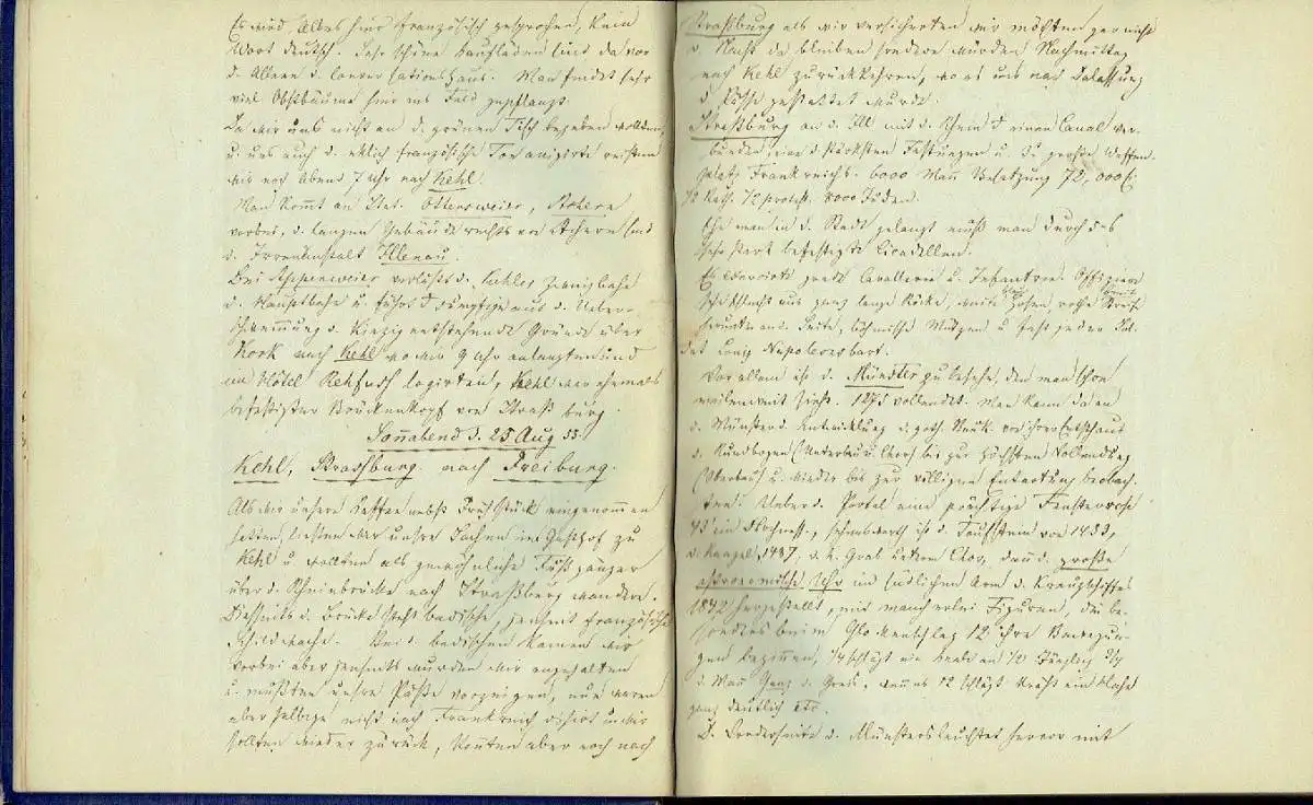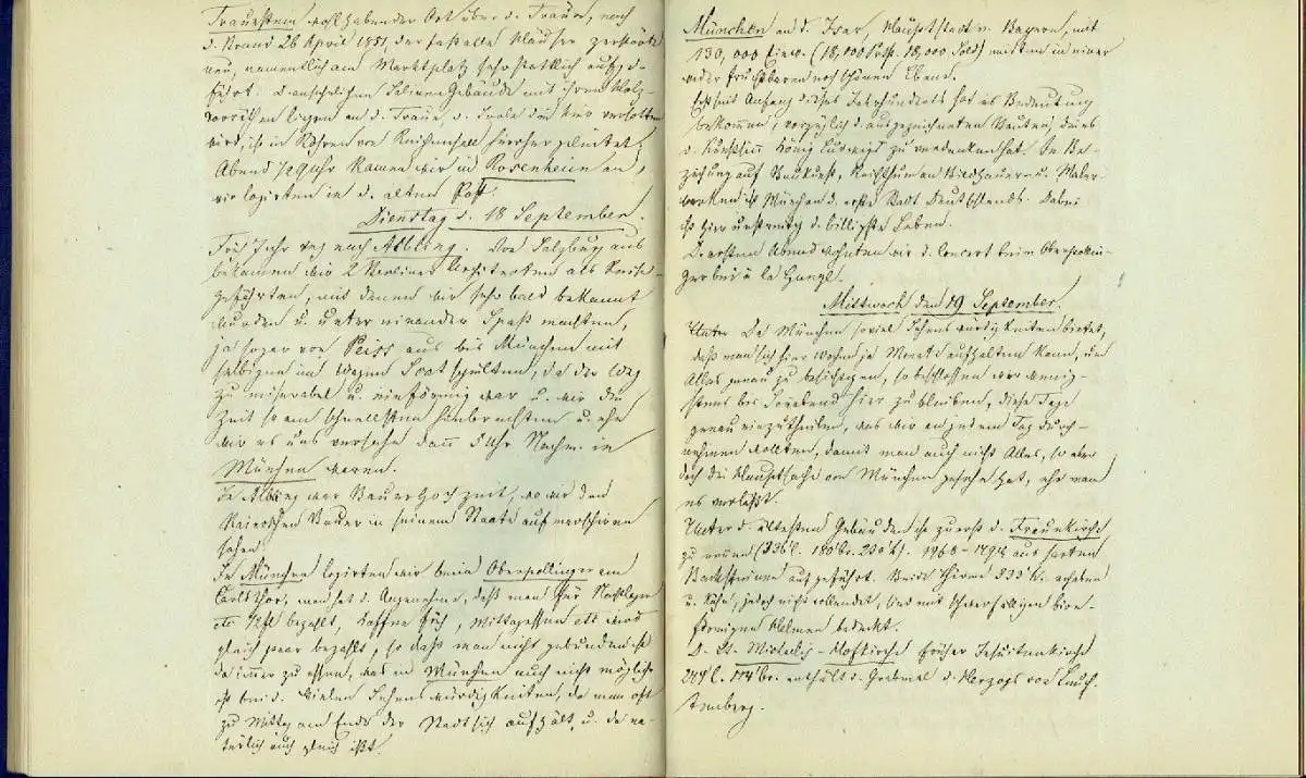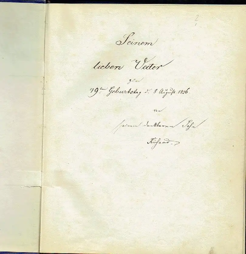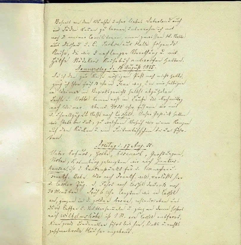 guter Zustand, Gebrauchs- und Alterungsspuren: Buchrücken defekt - Rückseite berieben - Einbandecken und -kanten teils gering abgenutzt - Rückseite rechts oben mit Wasserschaden, Flecken davon auch auf den letzten 5 (leeren) Blatt - Seiten überwiegend sauber und ordentlich, gelegentlich schwach stockfleckig - eine Seite senkrecht gefalten, der Autor Richard (ohne Familienname) schenkt seinen Reisebericht am 8. August 1856 seinem unbenannten Vater zum 49. Geburtstag Handschrift einer Reise, die am 16. August 1855 beginnt und am 2. Oktober an der Göltzschtalbrücke endet, er beginnt sie mit Hilfe von Baedekers Reisebuch und 2 seiner Comilitonen aus Dessau und Halle in Weimar mit dem Schnellzug nach Cassel und Carfeld, Leinen, ca. 17,5 x 21,5, 131 Seiten