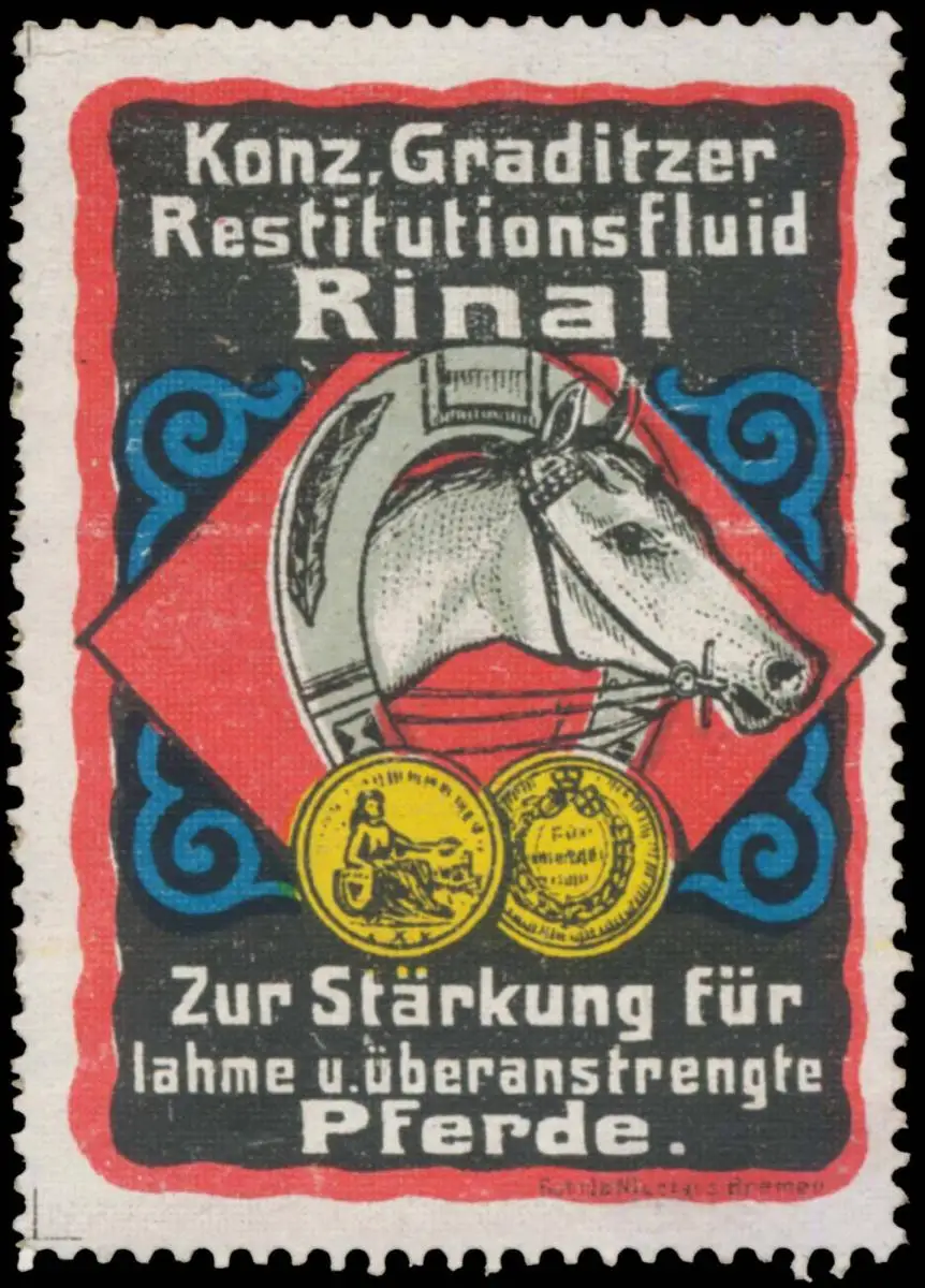 Konz. Graditzer Restitutionsfluid Rinal zur Stärkung für lahme und überanstrengte Pferde, Größe/Zustand: 6x4 , guter Zustand, Original alte Reklamemarke die seinerzeit für die Werbung benutzt wurde