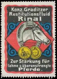 Konz. Graditzer Restitutionsfluid Rinal zur Stärkung für lahme und überanstrengte Pferde, Größe/Zustand: 6x4 , guter Zustand, Original alte Reklamemarke die seinerzeit für die Werbung benutzt wurde