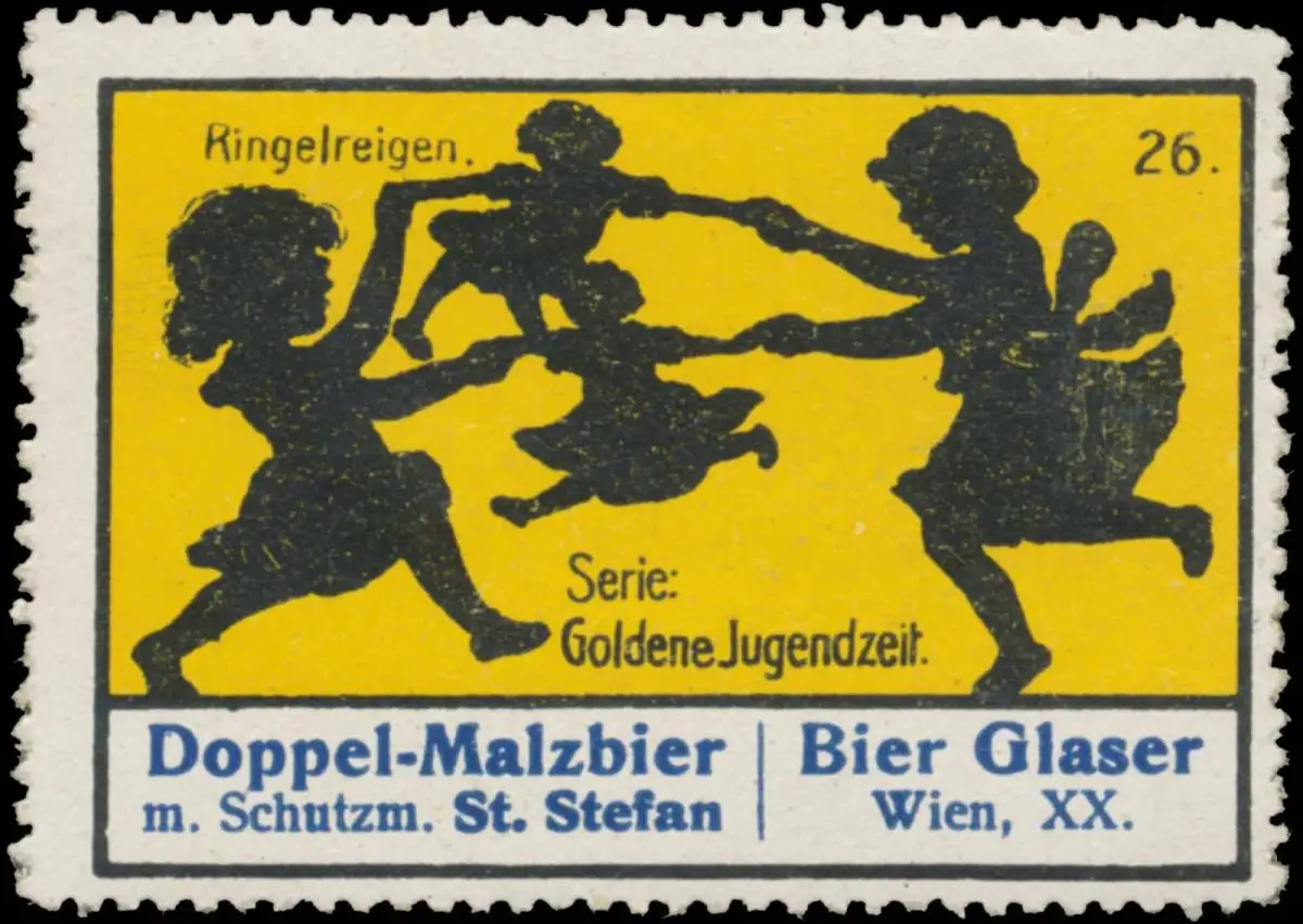 Doppel-Malzbier mit Schutzmarke St. Stefan, Serie: Goldene Jugendzeit, Kinder, Tanz. Tanzen, Bild 26, Größe/Zustand: 4x6 , guter Zustand, Original alte Reklamemarke die seinerzeit für die Werbung benutzt wurde