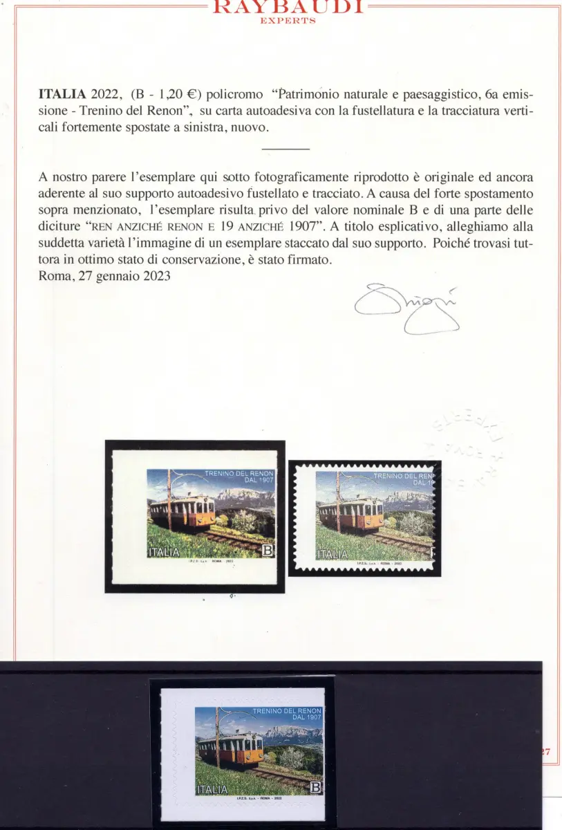postfrisch - Vollgummi - - Rittner Zug Nr. 4208 mit stark nach links verschobener Stanzung und Spurführung - durch starke Verschiebung fehlt dem Exemplar der Nennwert B - (Kat. Einheitliche Nr. 4271Ba) - Selten - Zert. Ray. - Kat. euro 450 Cod.818/182