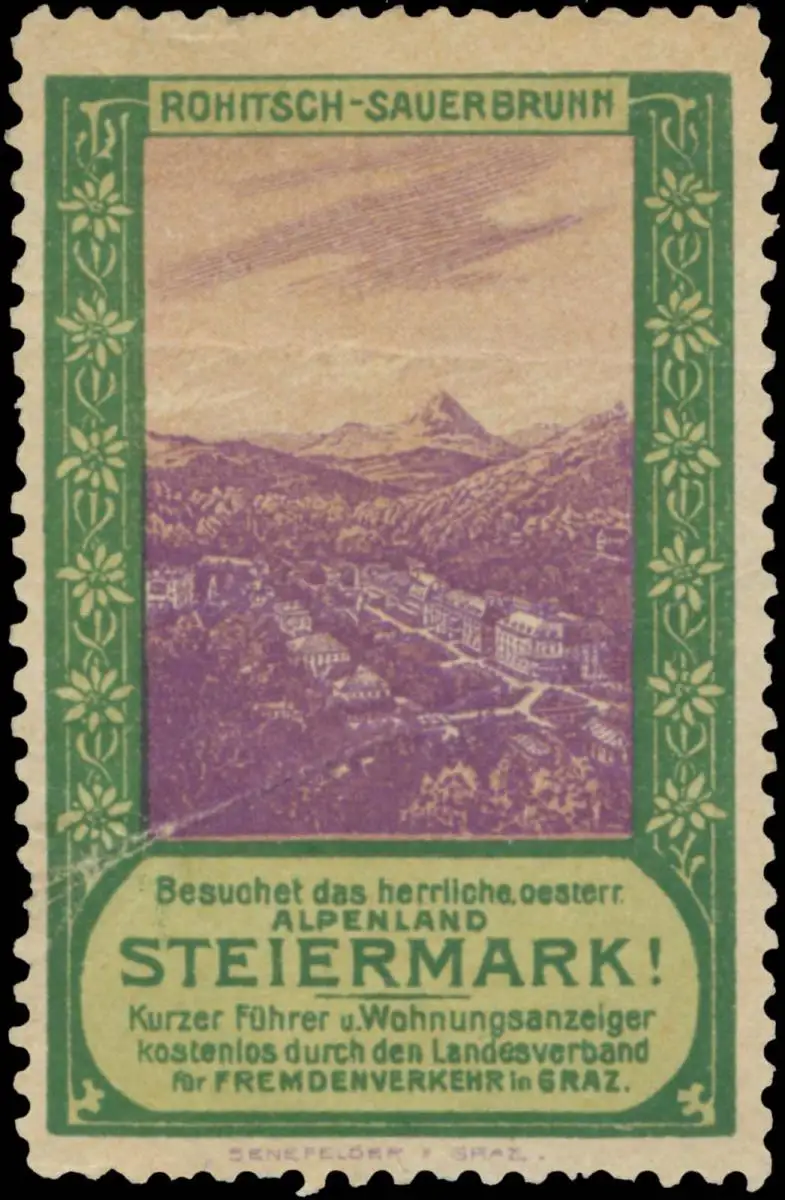 Besuchet das herrliche Österreichische Alpenland die Steiermark! Druck: Senefelder, Graz, Größe/Zustand: 4x5 , guter Zustand, Original alte Reklamemarke die seinerzeit für die Werbung benutzt wurde