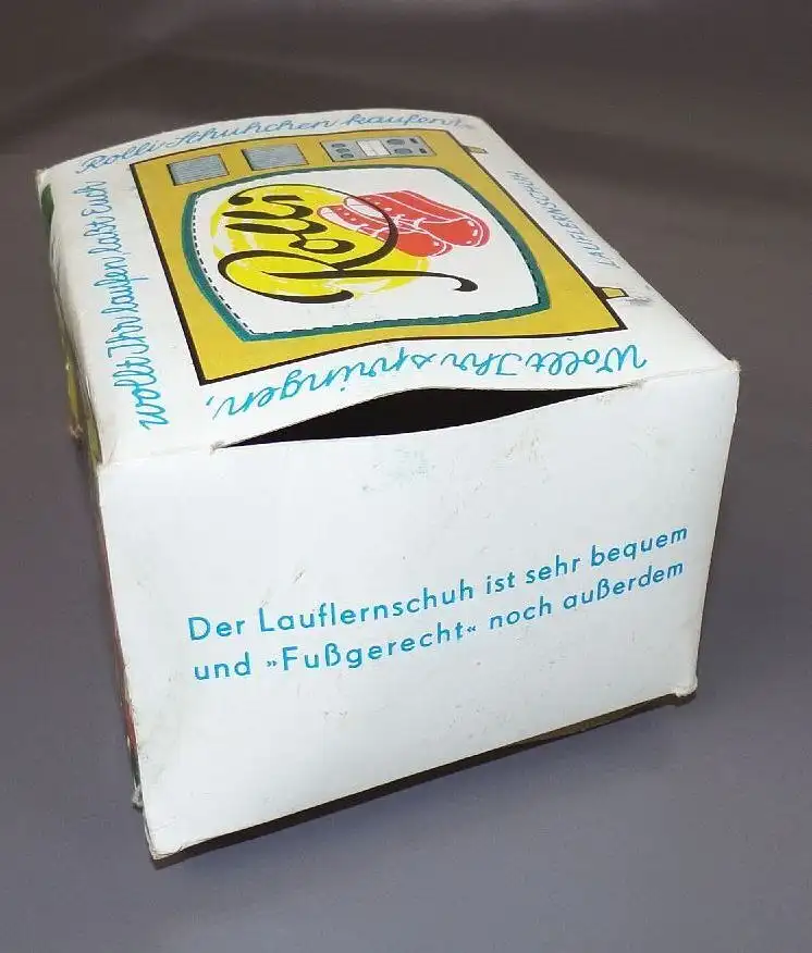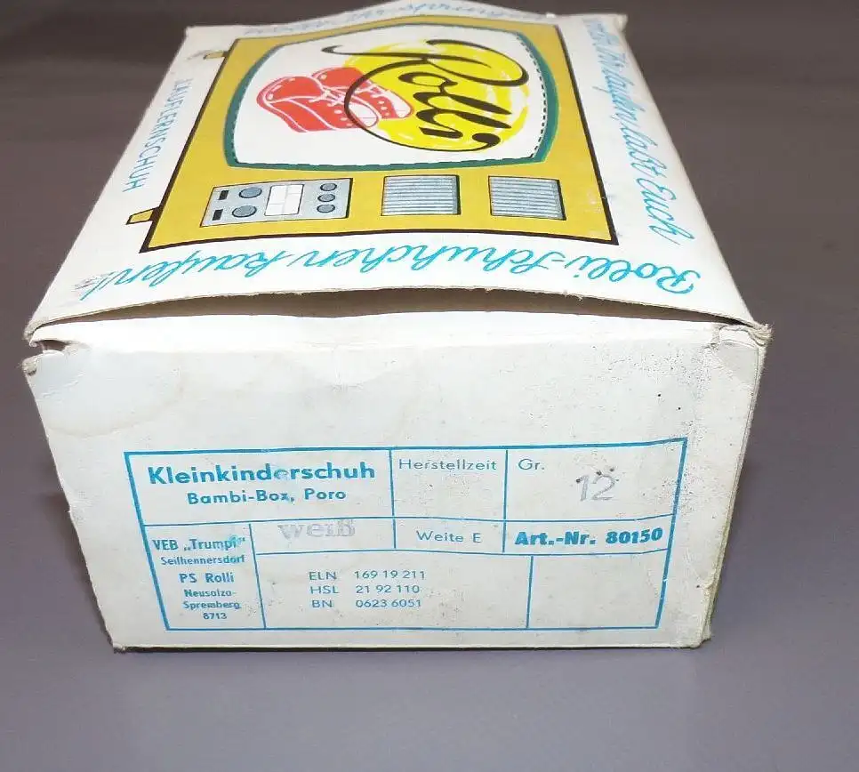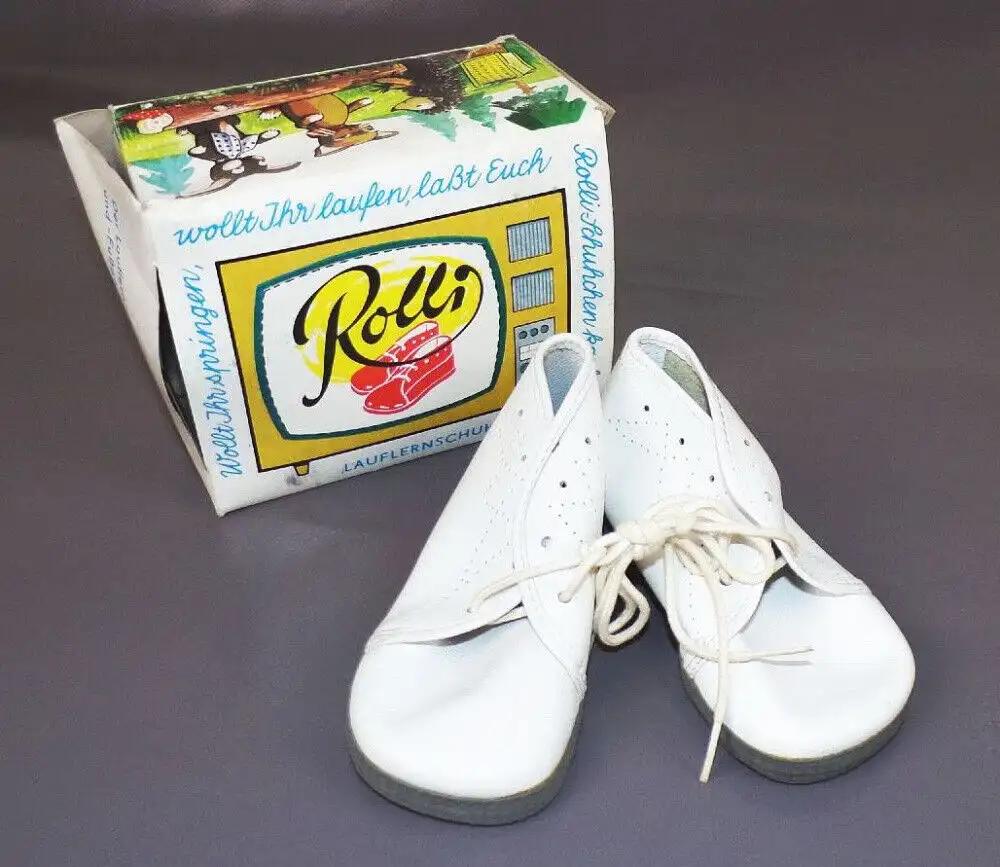 Originale Lauflernschuhe, ungetragen, weiß in der DDR Größe 12 ( Sohlenlänge: 12,5 cm ). Hergestellt vom VEB Trumpf Seifhennersdorf. Mit Originalkarton. Erhaltung: Karton leicht eingerissen, alles weitere siehe bitte Fotos.