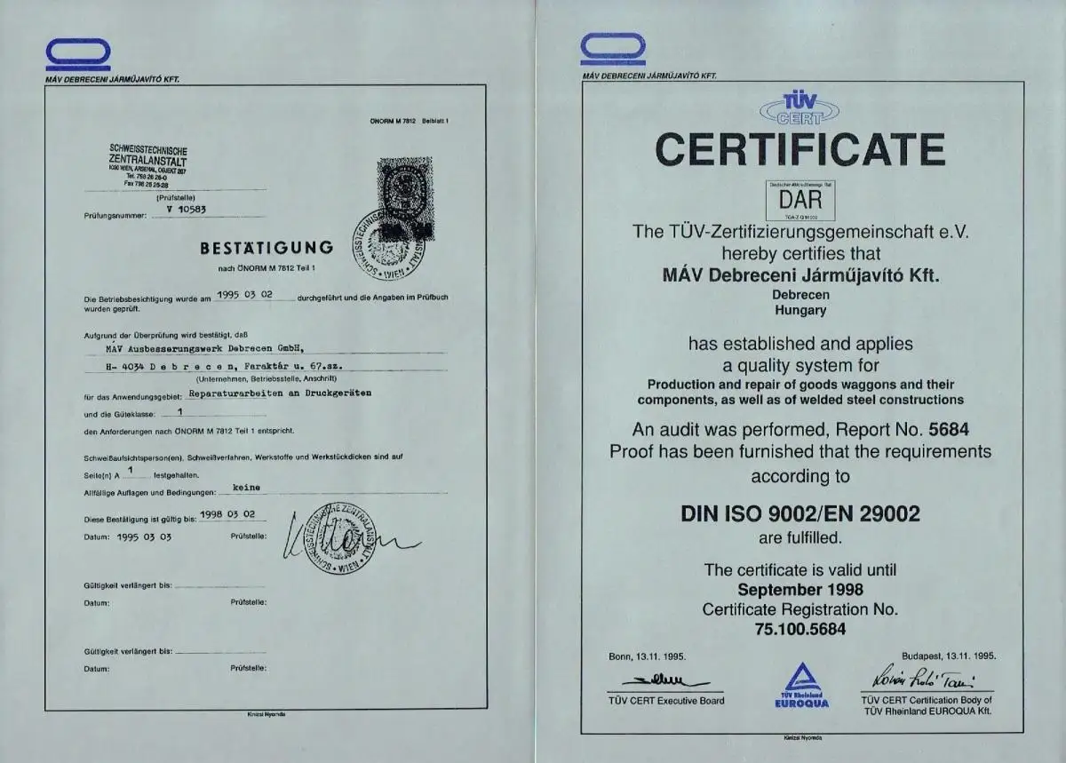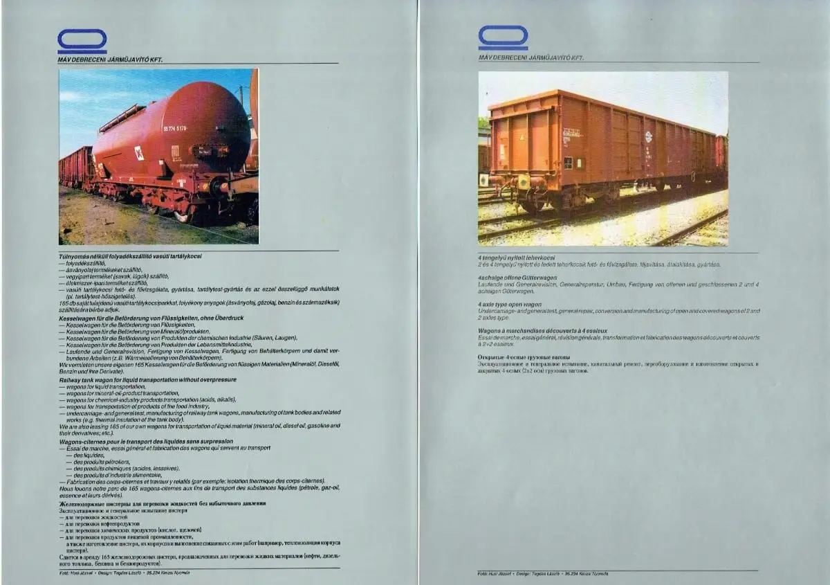 sehr guter Zustand, geringe Gebrauchs- und Alterungsspuren: Mappe etwas abgenutzt mit kleinen Randblessuren - Vorderseite rechts oben Ecke geknickt - Prospekte tadellos, Mappe enthält ein Begrüßungswort in englischer Sprache und folgende Prospekte - Certificate-Kopie von 1995, gültig bis 1998 (ein Blatt, einseitig bedruckt) - Kopie der Bestätigung von der Schweisstechnischen Zentralanstalt in Wien 1995 (ein Blatt, einseitig bedruckt) - ein Prospekt "Rolling Road" (4 Seiten mit 6 Bildern) in englischer Sprache - 8 Prospekte von Güterwagen (jeweils einseitig bedruckt, Text auf Englisch + Deutsch + Ungarisch + Russisch + Französisch) "Ladies and Gentlemen, Let me greet you in the name of the management of an enterprise haw almost hundred years of experience. MÁV Debreceni Jármüjavitó Kft. has been working in the field of repairer railway vehicles (steam locomotives, passenger carriages and wagons successfully since 1898. With our own personnel of 900 we are performing repair and maintenance works mainly for MAV (Hungarian State Railways). Our main activities are repair, renewal of towed vehicles, manufacturing er parts, repair of machine tools, cranes and repair of railway plate springs arc wheel sets as well. We perform a considerable activity at the renewal of railway vehicles or nostalgia character, representing museum value. Within the Hungarian State Railways we have the only internal washer equipment for tank wagons and a modern external washing equipment b wagons attached to sewage treatment units guaranteeing the observance a' strict environmental regulations. Our quality assurance system implemented in accordance with ISO 9002 provides for full and perfect satisfaction of our customers' requirements. Parallel with the orders placed by MÁV we are also fulfilling orders receives from other domestic and foreign partners, including the repair of tank wagons for gas transportation, tank wagons for transportation of dangerous materials (sulphuric acid, alkali), wagons for transportation of powders and other buk goods and wagons for passenger car transportation. We intend to use our experience gained at manufacturing of special railway wagons also to participate in international tenders to be announced for the development of railway vehicles. Therefore we actually are manufacturing truck transportation wagons of 10 axles, low construction type, on the basis of an ABB-HENSCHEL license. Utilising our tank manufacturing machine line we also undertake to manufacture new railway tank wagons and tanks for other purposes. Our company is provided with wide ranging technology, rendering cold and hot metal working, wood working (we have an electronically controlled kiln dryer), pipe assembly, steel structure manufacturing (cranes, transfer table), various consoles and naturally also the painting and varnishing of these products. Beyond the above activities we are leasing 165 of our own tank wagons for liquid material transportation (mineral oil, gasoline and their derivatives; etc.) ...", kartoniert / Papier, ca. 21,5 x 30,5, Mappe mit Prospekten: 14 Seiten