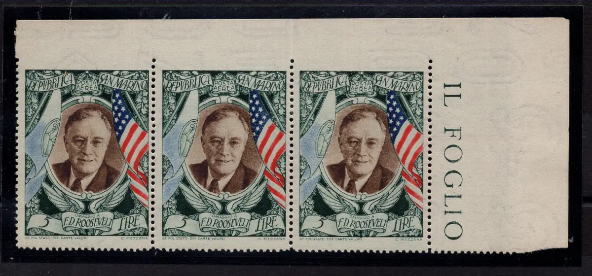 MNH - Vollgummi - Roosevelt 5 Lire Luftpost Nr. 63d Dreiwinkel-Blattstreifen oben ungezahnt, neuer perfekter Vollgummi - Kat. euro 240 Cod. 3377/WEB