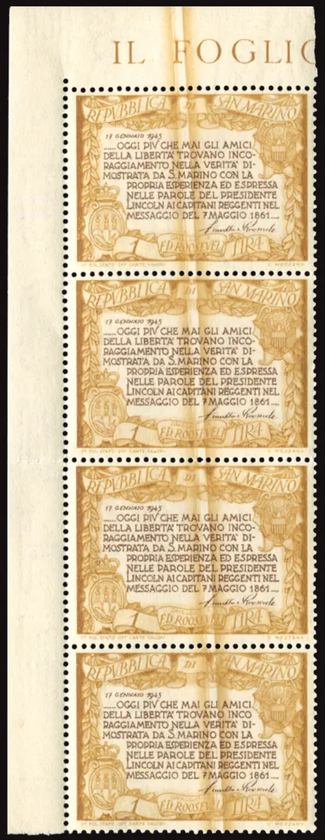Roosevelt Lire 1 Sorte chirurgischer Schnitt Vollgummi MNH - Roosevelt Lire 1 Nr. 301 vertikaler Streifen von vier a. f. mit auffälligem chirurgischem Schnitt an allen Exemplaren - Seltene gelegentliche Sorte Cod. 788/16