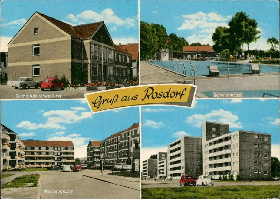 Rosdorf Neubaugebiet, Gemeinde-Verwaltung, Schwimmbad, Wohnblock 1983