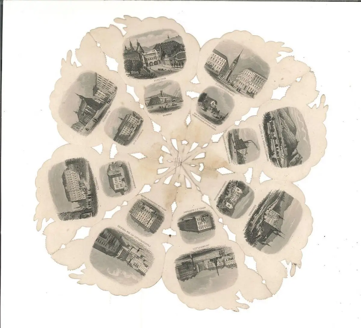 Bemerkungen: Rose von Graz, die 28 kleine Stahlstichansichten von Graz, so etwa Jacominiplatz, Domkirche, Maschinen Fabrick v. J. Körösi oder Burgthor, zeigt. 2 Segmente sind chromolithographisch mit Rosen bedruckt. Der Hamburger Verlag von C. Adler publizierte in den 1860er Jahren eine Vielzahl derartiger Rosen mit Ansichten von Wien, Hamburg oder auch Franzensbad.