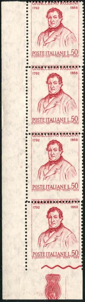 Rossini Sorte ungezähnt unten RRR Vollgummi - Rossini Nr. 1096a wunderschöner Streifen von vier Exemplaren a. von f. mit dem letzten ungezahnten Exemplar unten und drei oberen mit der nach unten verschobenen horizontalen Verzahnung (Nr. 1096ba) - Sehr selten, unten sind nur 10 ungezahnte Exemplare bekannt - Kat. euro 4.000++ Cod. 752/13