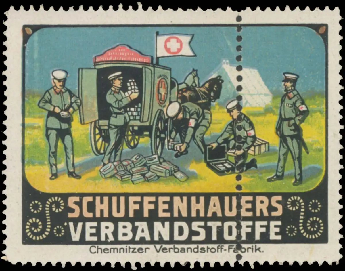 Schuffenhauers Verbandstoffe, Größe/Zustand: 5x6 , Fehldruck, guter Zustand, Original alte Reklamemarke die seinerzeit für die Werbung benutzt wurde
