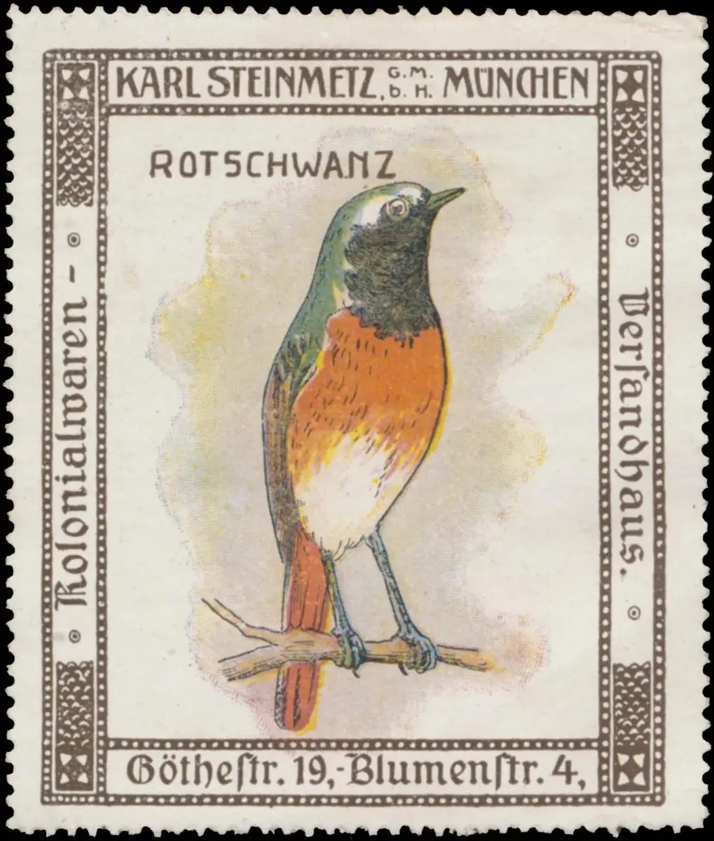 Vogel-Serie, Kolonialwarenversandhaus, Goethestraße 19, Blumenstraße 4, Größe/Zustand: 6x6 , guter Zustand, Original alte Reklamemarke die seinerzeit für die Werbung benutzt wurde