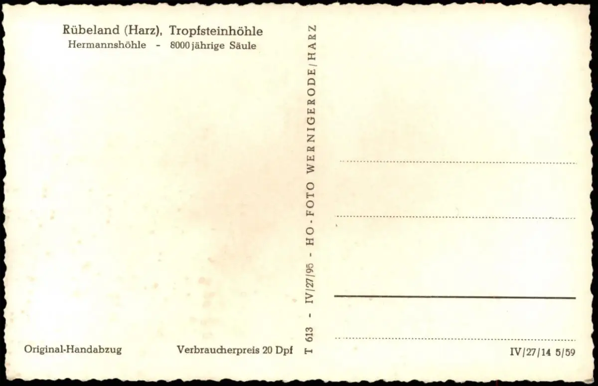 Rübeland Harz Tropfsteinhöhle Hermannshöhle 8000 jährige Säule 1959