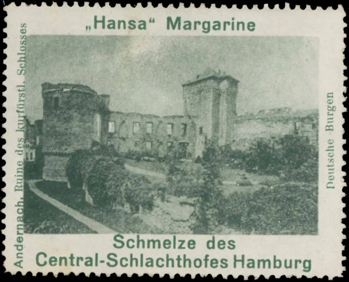 Deutsche Burgen, Hansa-Margarine, Schmelze des Central-Schlachthofes , Größe/Zustand: 5x6 , guter Zustand, Original alte Reklamemarke die seinerzeit für die Werbung benutzt wurde