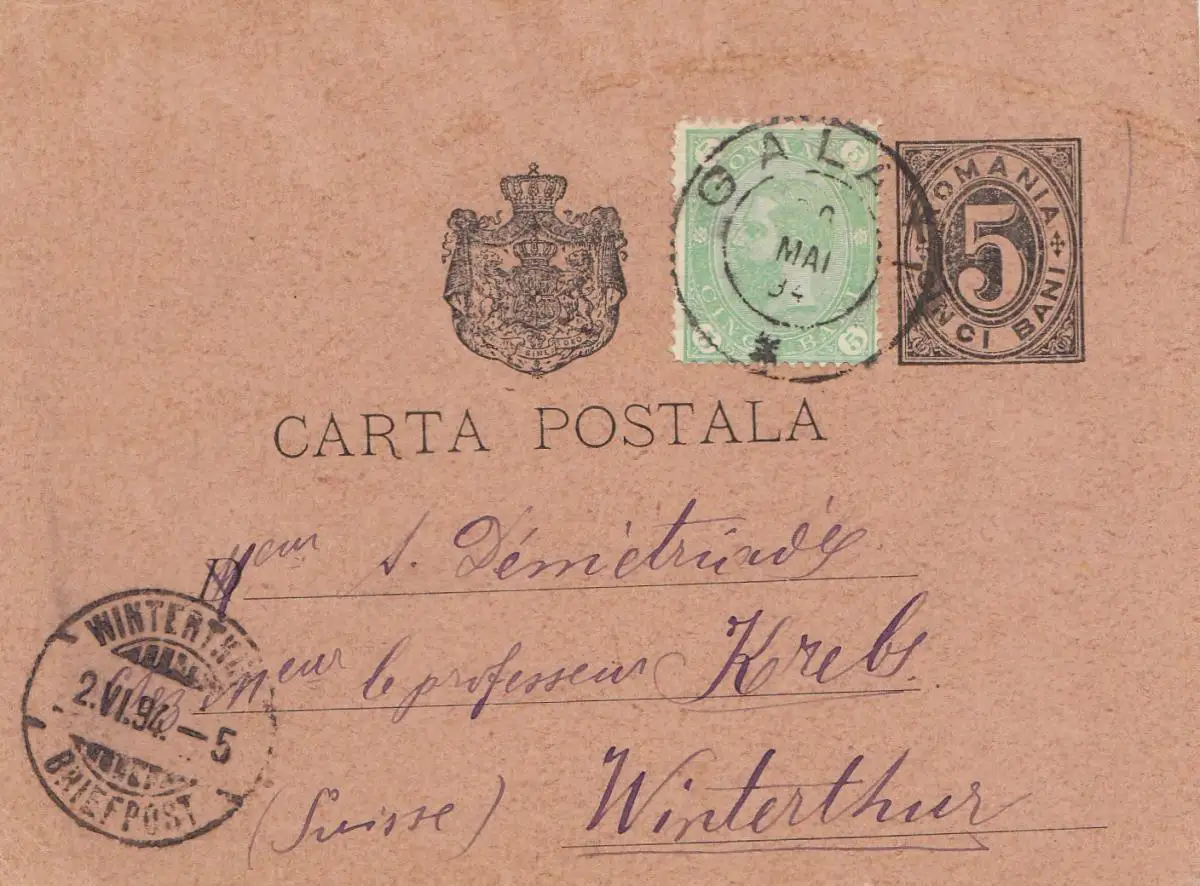 Rumänien: 1894: Ganzsache Galati nach Winterthur