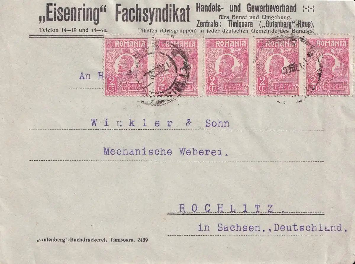 RUMÄNIEN 1922 2 L/ Mi 273 4er Streifen BRIEF TIMISOARA-ROCHLITZ/ SACHSEN