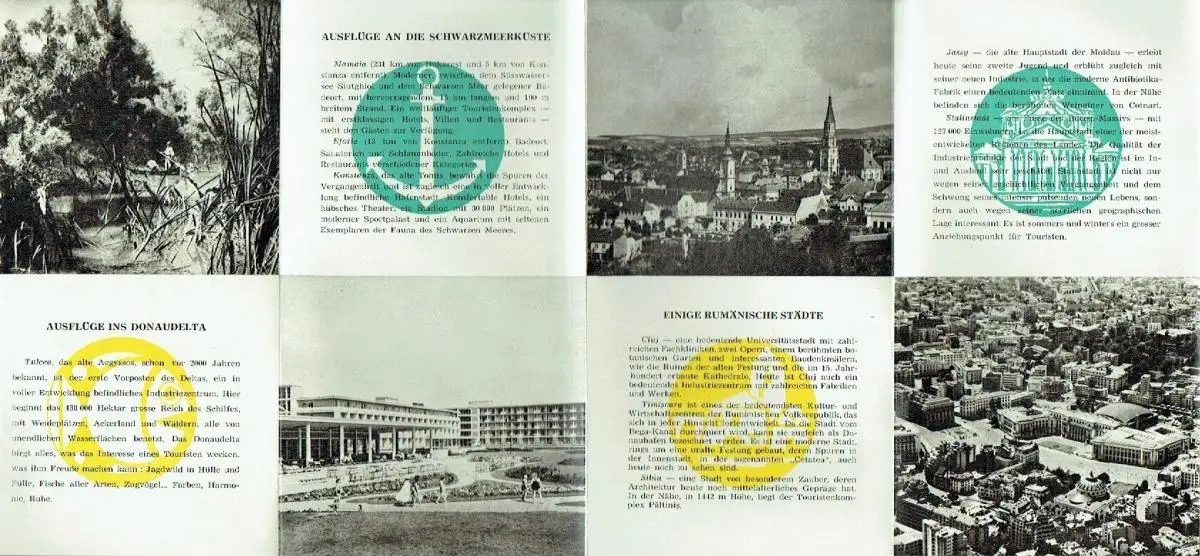 sehr guter Zustand, geringe Gebrauchs- und Alterungsspuren: nahezu neuwertig, Rumänien und Carpati laden ein: Veranstaltungen, kleiner Bukarester Reiseführer, Museen, Ausflüge, einige rumänische Städte mitgebracht von einer DDR-Mittelmeer-Rundreise vor dem Mauerbau, Papier, ca. 11 x 20 (aufgeklappt ca. 66 x 20), 12 Seiten mit 7 Fotos und einigen Illustrationen