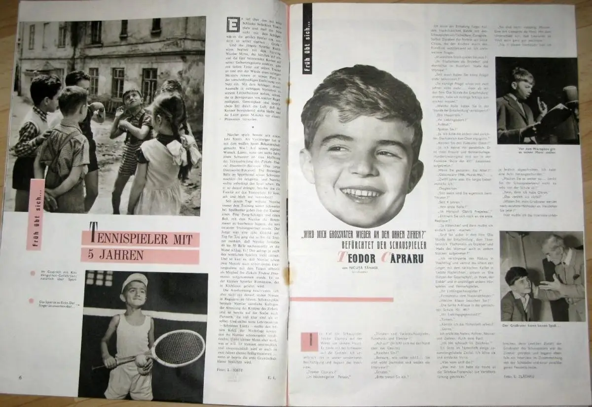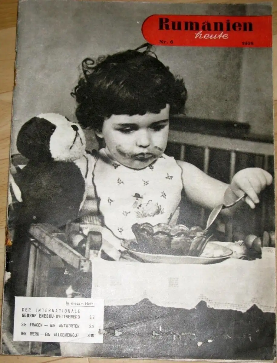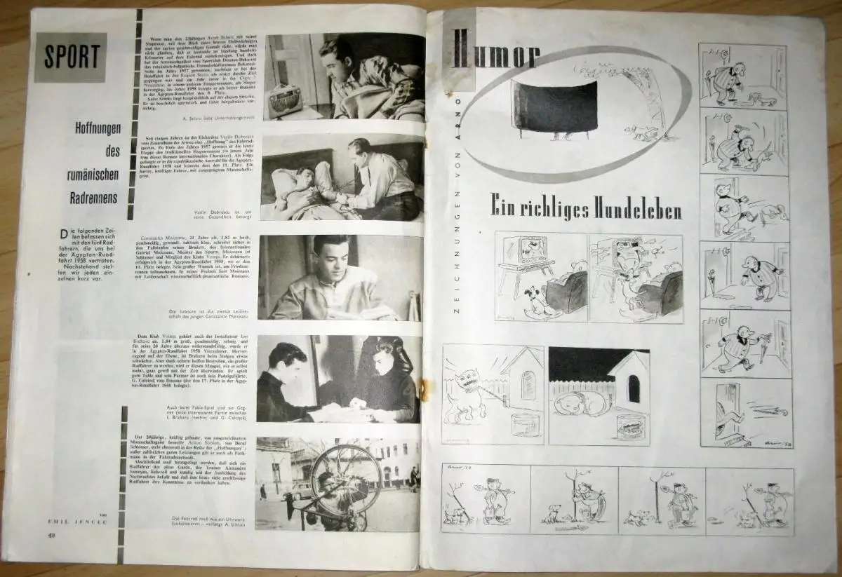 noch guter Zustand, Gebrauchs- und Alterungsspuren: Vorderseite unten etwas beschabt / zerkratzt - die stark rostenden Klammern habe ich entfernt und durch neue ersetzt, geblieben sind an den Stellen der alten kleine Rostflecke und kleine Fehlstellen im Umschlag - Umschlag und Seiten teils etwas eselsohrig - auf Seite 10 wurde ein Bild herausgeschnitten (ca. 9x8 cm), Im September in Bukarest: Internationaler George Enescu-Wettbewerb - Früh übt sich... - Sie fragen — wir antworten - Ein Nein dem Krieg — ein Ja dem Frieden - Das Nationaltheater in Jassy - Text: A. Sahighian Foto: A. Mendrea - Ihr Werk — ein Allgemeingut (Biografien von Victor Babes, Emil Racovitza, Gheorghe Marinescu, Vasile Pîrvan, Traian Lalescu) - Ion Tarangoiu - geboren im Alter von 40 Jahren - Licht und Leid in Tonitzas Werk - P. Comarnescu - CP 4 im Dienste des Lebens - R. Tiulescu Foto: G. Dan - „Erweitern wir die kulturellen Austausche" erklären Roberto de Lamonica und Octavio F. de Araujo - Rumänisch-chinesisches Kulturabkommen - Drei intellektuelle Griechinnen besuchen Rumänien - M. Dascalu - „Länder, die man gleich ins Herz schließt" - Lilika Nakou - Nach vielen Jahren in der Fremde kehrt Maria Riza wieder heim - Nicht allein um die Traktoren geht es in den MTS - Der Abendstern - Mihail Eminescu Zeichnungen von G. Labin - Traian Savulescu, Vorsitzender der Akademie der RVR - P. Constantinescu-Iasi - Filatelie - A. Calmi - Zu Besuch bei RUMÄNIEN HEUTE - Sportlieblinge der Berichterstatter - E. Ionescu (Georghe Negrea, Angelica Rozeanu, Iosif Sirbu, Valeriu Calinoiu) - Hoffnungen des rumänischen Radsports: Aurel Selaru, Vasile Dobrescu, Constantin Moiceanu, Ion Braharu, Ariton Simion - Karikaturen von Arno - u. a, Softcover, ca. 25,5 x 35, 48 Seiten mit zahlreichen Bildern