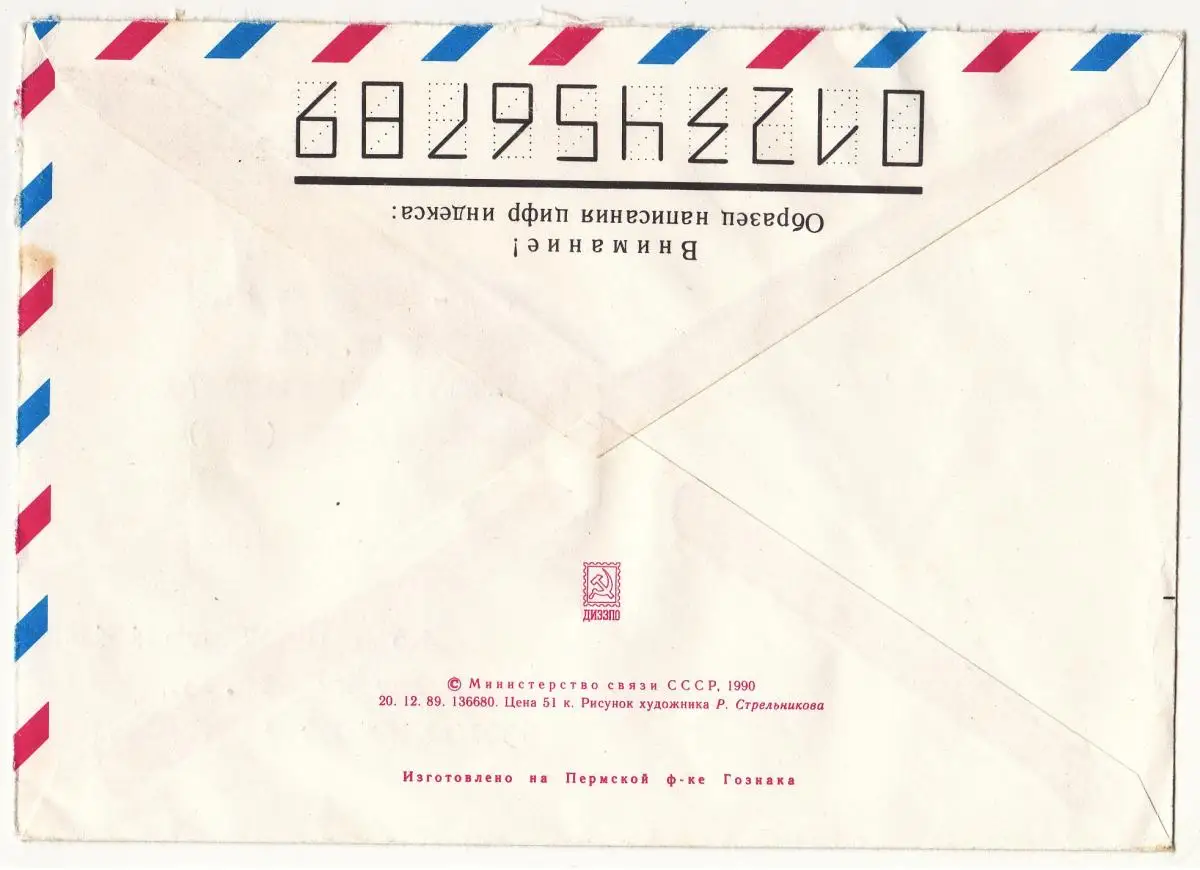 Der Brief ist gelaufen am 01.04.1990 von Novosibirsk nach Stuttgart. Der Briefumschlag ist oben und seitlich rechts teilweise geöffnet. Leichte Beförderungsspuren, guter bis sehr guter Zustand.