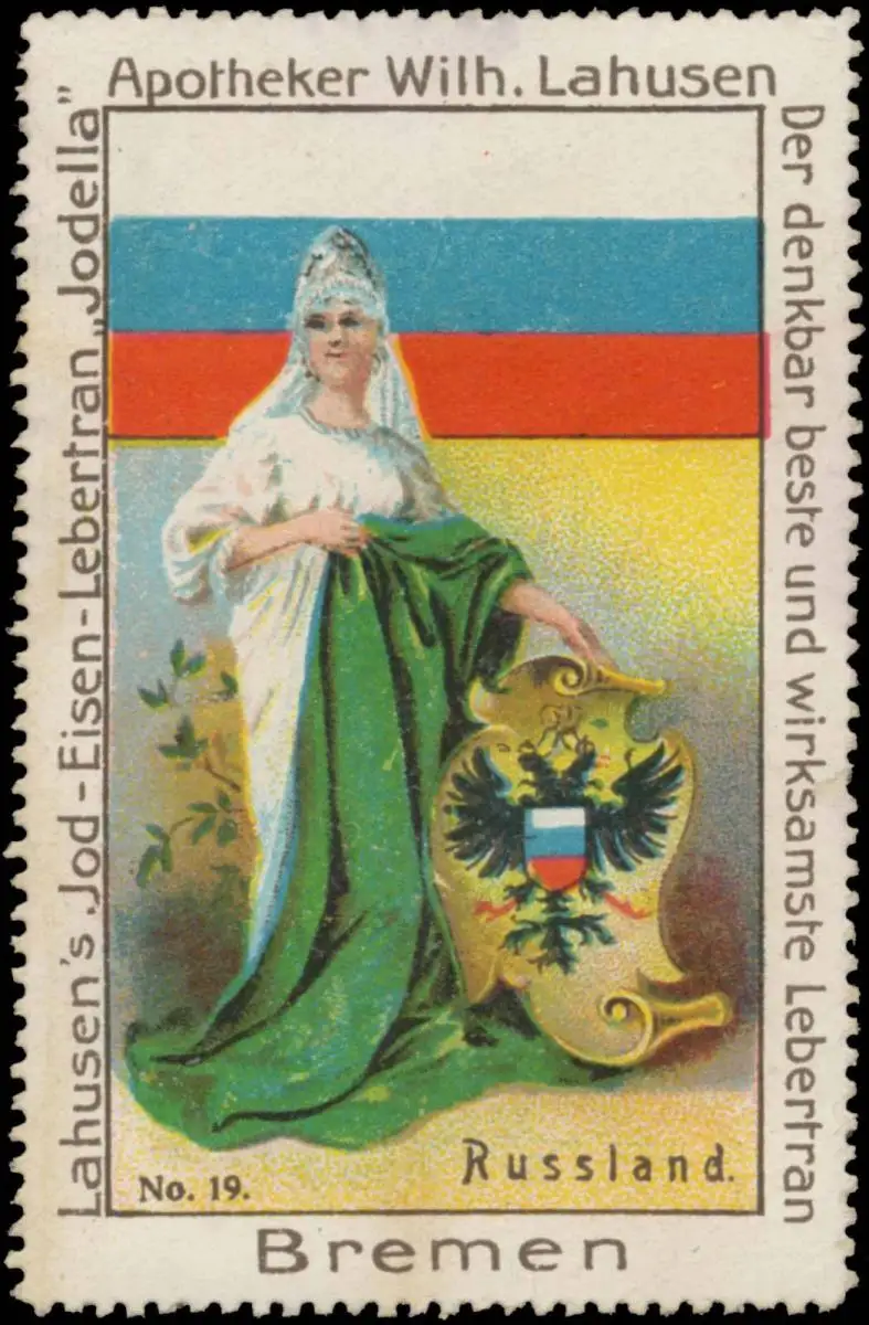 Rußland, Flaggen-Serie Bild 19, Lahusens Jod-Eisen-Lebertran Jodella, Größe/Zustand: 7x5 , guter Zustand, Original alte Reklamemarke die seinerzeit für die Werbung benutzt wurde