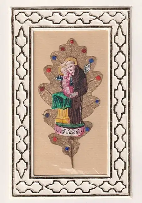 Bemerkungen: Mittig ist eine Gouache-Applikation des Heiligen Antonius von Padua (1195-1231), ein Franziskanermönch der u. a. wegen seiner Redegewandtheit verehrt wird, zu sehen. In der Darstellung hält Antonius das Christuskind auf dem Arm. Der Gedenktag des Heiligen Antonius ist der 13. Juni. Die Blattspitzen sind mit kleinen bunten Papierapplikationen versehen.