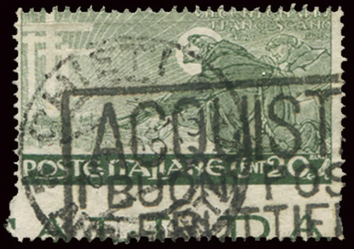 S. Francesco Cent. 20 Sorten verschobene untere Verzahnung gebraucht - St. Francesco Cent. 20 n. 192eb mit stark nach unten verschobener unterer Verzahnung, Bogenrand - durch die starke Verschiebung ist die Briefmarke um mm höher. 5 - Selten - Kat. euro 1.300 Cod. 38/14