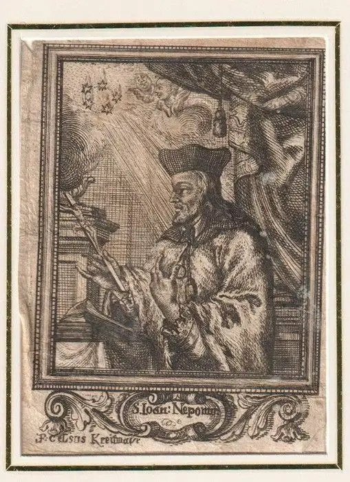 Bemerkungen: Dargestellt ist der Brückenheilige Johannes von Nepomuk (1350-1393) als Hüftfigur in einem Kirchenraum. In seiner rechten Hand hält er ein Kruzifix. Von links obenerscheint ein Lichtstrahl mit einen Heiligenschein mit 5 Sternen. Johannes von Nepomuk erlitt sein Martyrium, indem er in Moldau geworfen wurde. Vorangegangen war eine Auseinandersetzung mit König Wenzel und dem Prager Erzbischof Jenzenstein. Der Gedenktag der Heiligen Johannes von Nepomuk ist der 20. März. Unten links in der Platte signiert:" F. Celsus Kreitmayr".