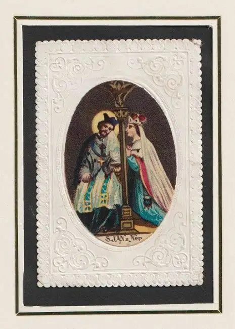 Bemerkungen: Zu sehen ist der Brückenheilige Johannes von Nepomuk (1350-1393) zusammen mit einer bekrönten, knienden weiblichen Figur in einem Beichtstuhl. Er ist u. a. der Schutzpatron von Böhmen und des Beichtgeheimnisses. Sein Martyrium erlitt er, indem er in Moldau geworfen wurde. Vorangegangen war eine Auseinandersetzung mit König Wenzel und dem Prager Erzbischof Jenzenstein. Der Gedenktag der Heiligen Johannes von Nepomuk ist der 20. März.
