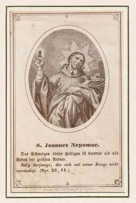Bemerkungen: Dargestellt ist der Brückenheilige Johannes von Nepomuk (1350-1393) im Medaillon. In seinen Händen hält er ein Kruzifix und seine Zungenreliquie. Im Zuge der Kanonisierung wurde 1719 das Grab des Heiligen im Veitsdom untersucht, dabei fand man angeblich seine unversehrte rote Zunge, die seitdem als Reliquie verehrt wird. Johannes von Nepomuk erlitt sein Martyrium, indem er in Moldau geworfen wurde. Vorangegangen war eine Auseinandersetzung mit König Wenzel und dem Prager Erzbischof Jenzenstein. Der Gedenktag der Heiligen Johannes von Nepomuk ist der 20. März. Die Familie Benziger war eine Verlegerfamilie aus Einsiedeln, um 1835 gründeten sie eine Lithographie- und Kolorieranstalt. Verso mit zeitgenössischer Wismung in Tinte: "Zur Erinnerung an den 16. November 1867".
