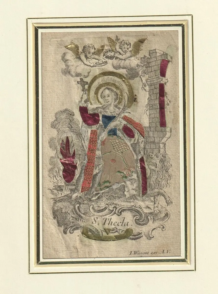 Bemerkungen: Als "Spickelbild" mit Metallfolie und Brokatstoff gestaltete Darstellung der Heiligen Thekla (Gedenktag: 23. September) mit ihren Attributen Löwe und Scheiterhaufen.