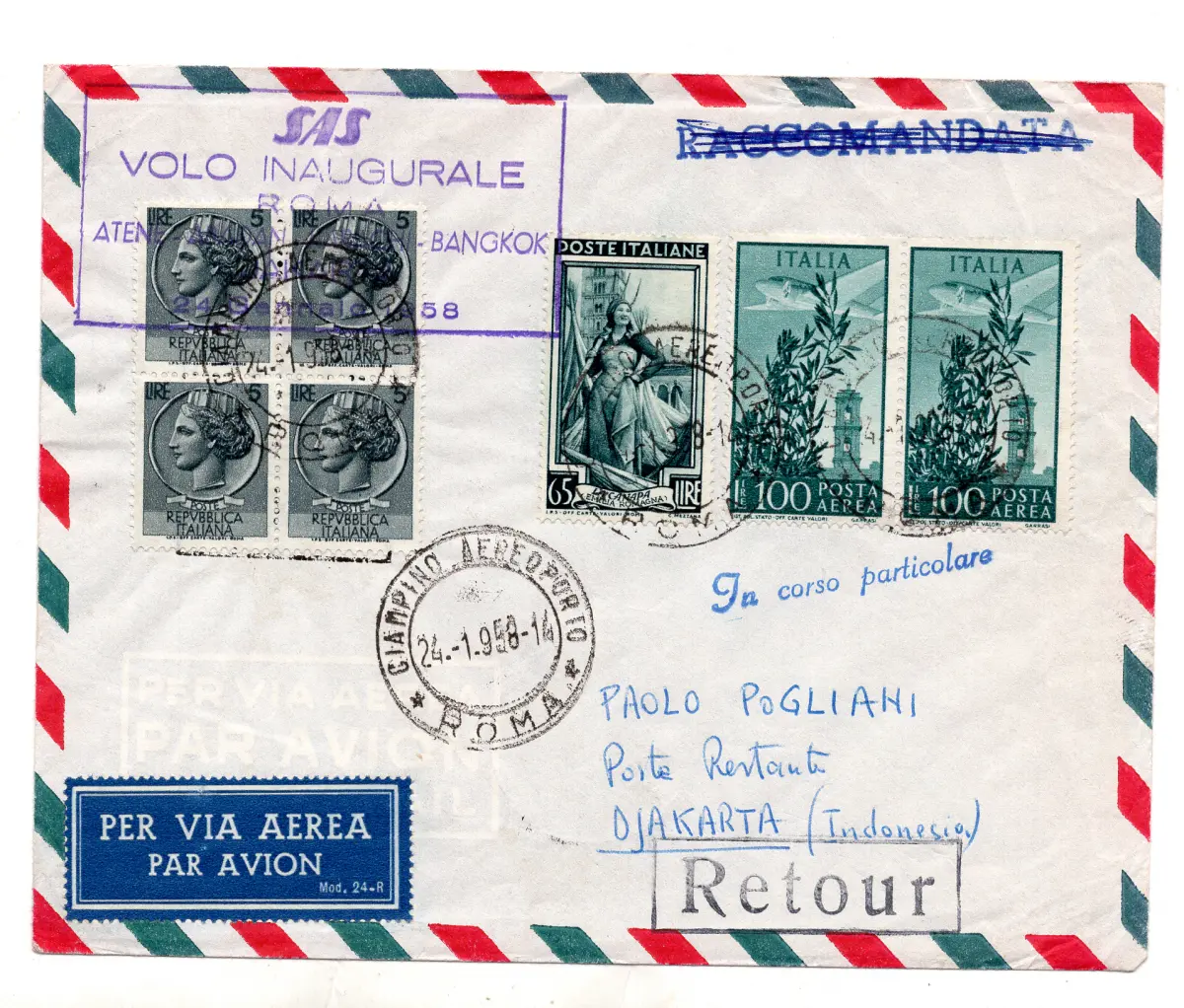 - S.A.S. Rom/Jakarta vom 24.1.58 - Aerogramm (Handelsumschlag) frankiert mit Nr. 650 + 762 x 4 + P.A. Nr. 148 x 2 - Ann. spezielle in violett Kat. n. 266AU - Nicht zitiert Nr. 578/18
