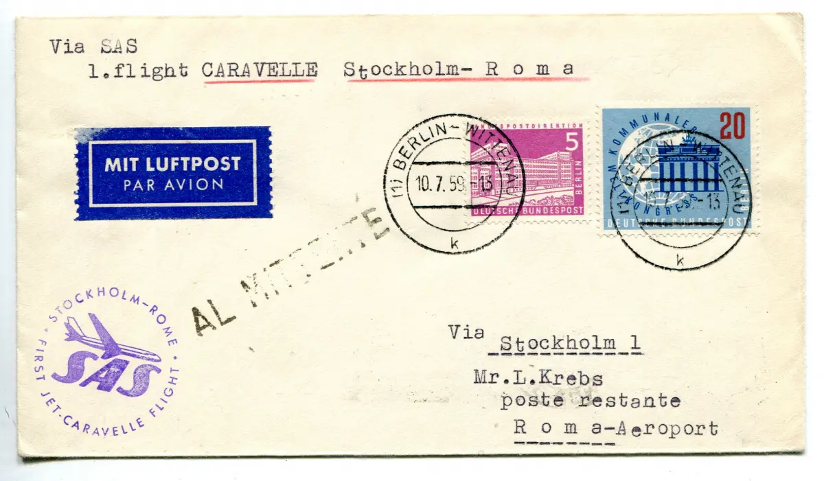- SAS Erstflug Stockholm/Rom vom 17.7.59 - Aerogramm von Berlin am 10.7.59 nach Rom weitergeleitet mit SAS-Flug - Ann. Spezial (Kat. Pellegrini Nr. 306DF, unveröffentlicht) - Seltene Nr. 1007/A