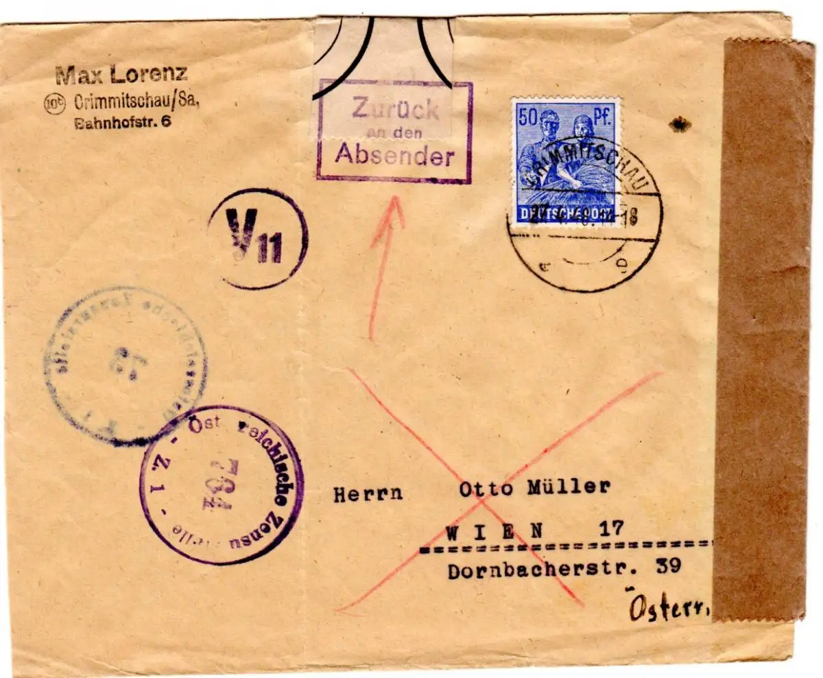 SBZ 1946, 50 Pf. auf Brief v. Crimmitschau n. Österreich. Amtlich verschlossen
