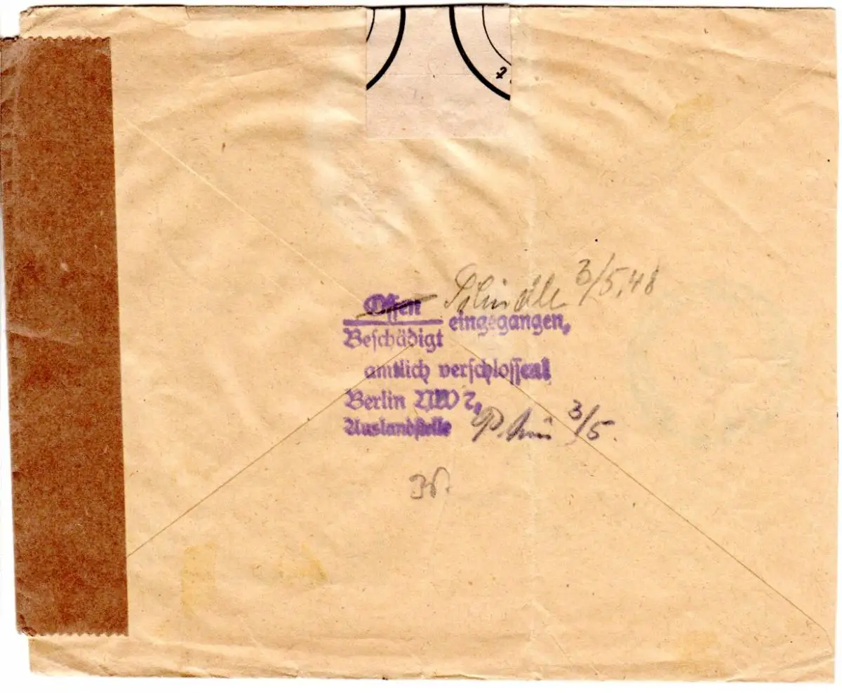 Zensurbrief m. Österr. R3 Zurück an den Absender sowie rückseitigem Hinweisstempel "Beschädigt eingegangen amtlich verschlossen! Berlin NW 7, Auslandsstelle" und amtl. Verschlussstreifen.