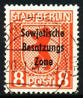 8 Pfg Wert aus der Freimarkenausgabe Berliner Bär mit Aufdruck "Sowjetische Besatzungs Zone"