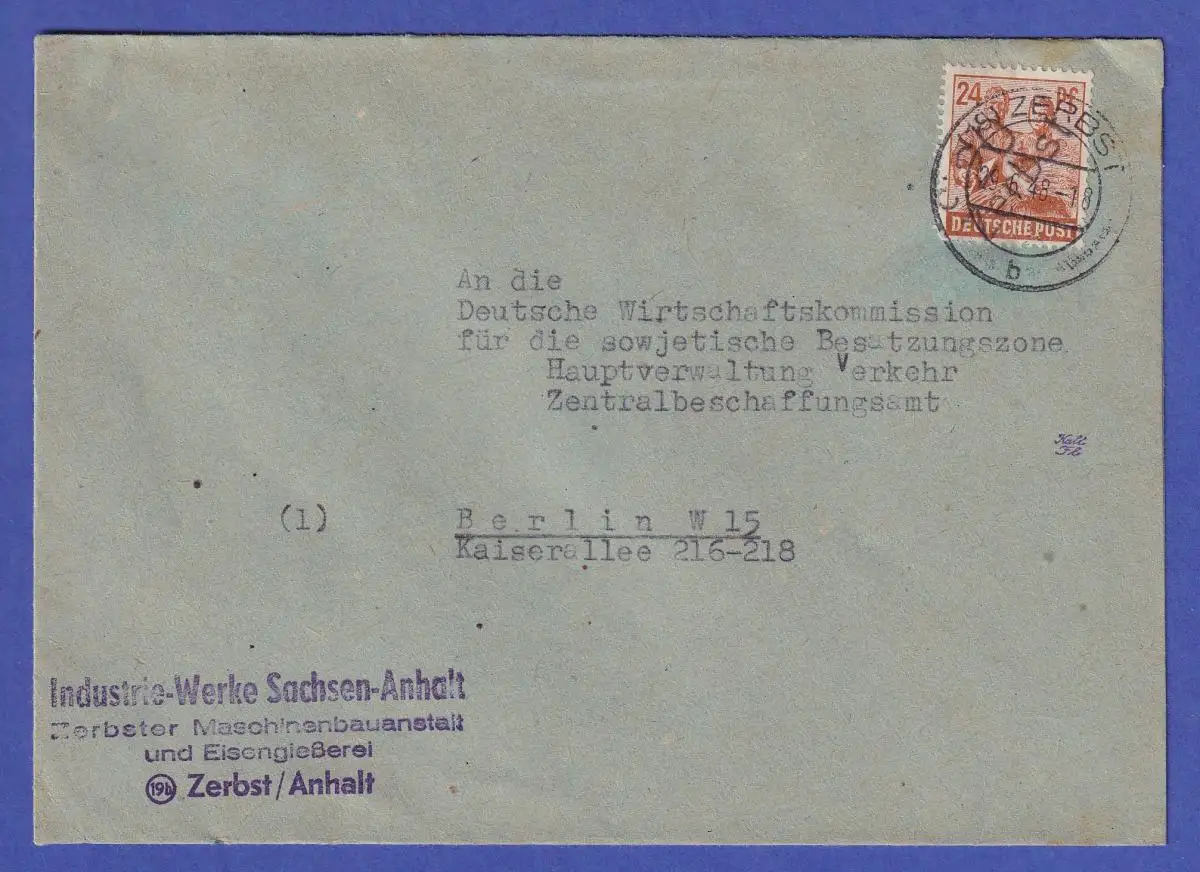 SBZ Bezirkshandstempel 20 Zerbst 24 Pfg. als EF auf Brief