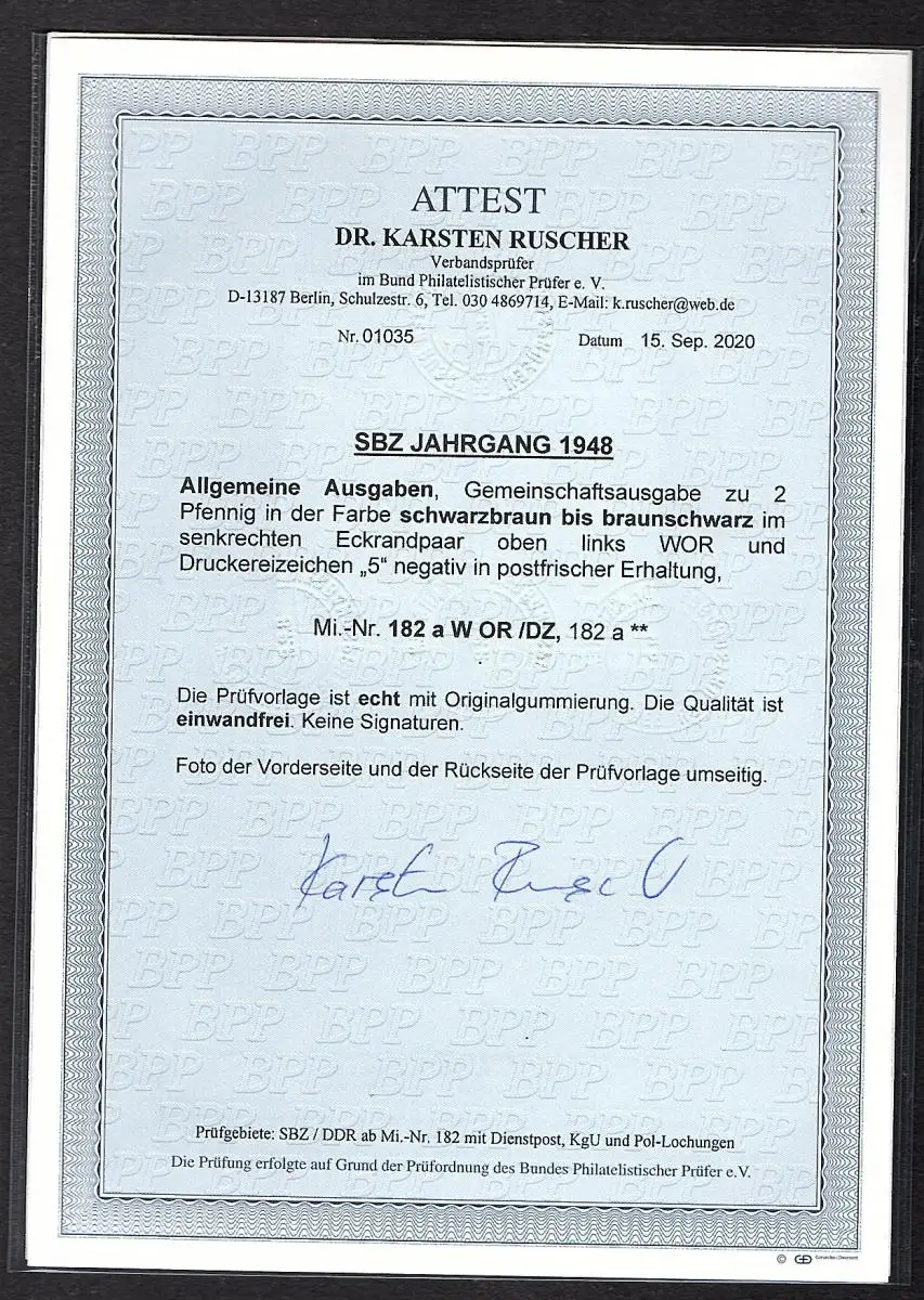 SBZ Mi.-Nr.182 a W OR/DZ postfrisch, FA. DR. Ruscher