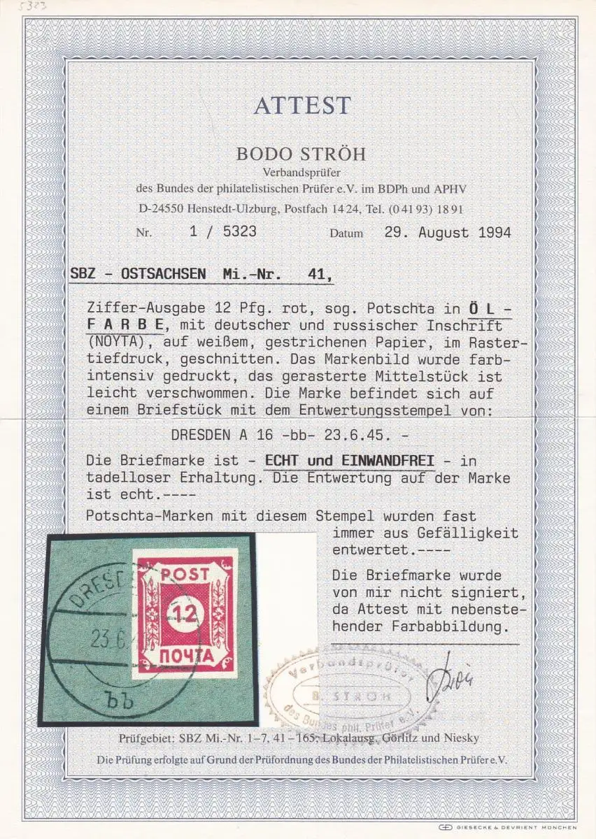 SBZ: MiNr. 41, gestempelt auf Briefstück, BPP Attest