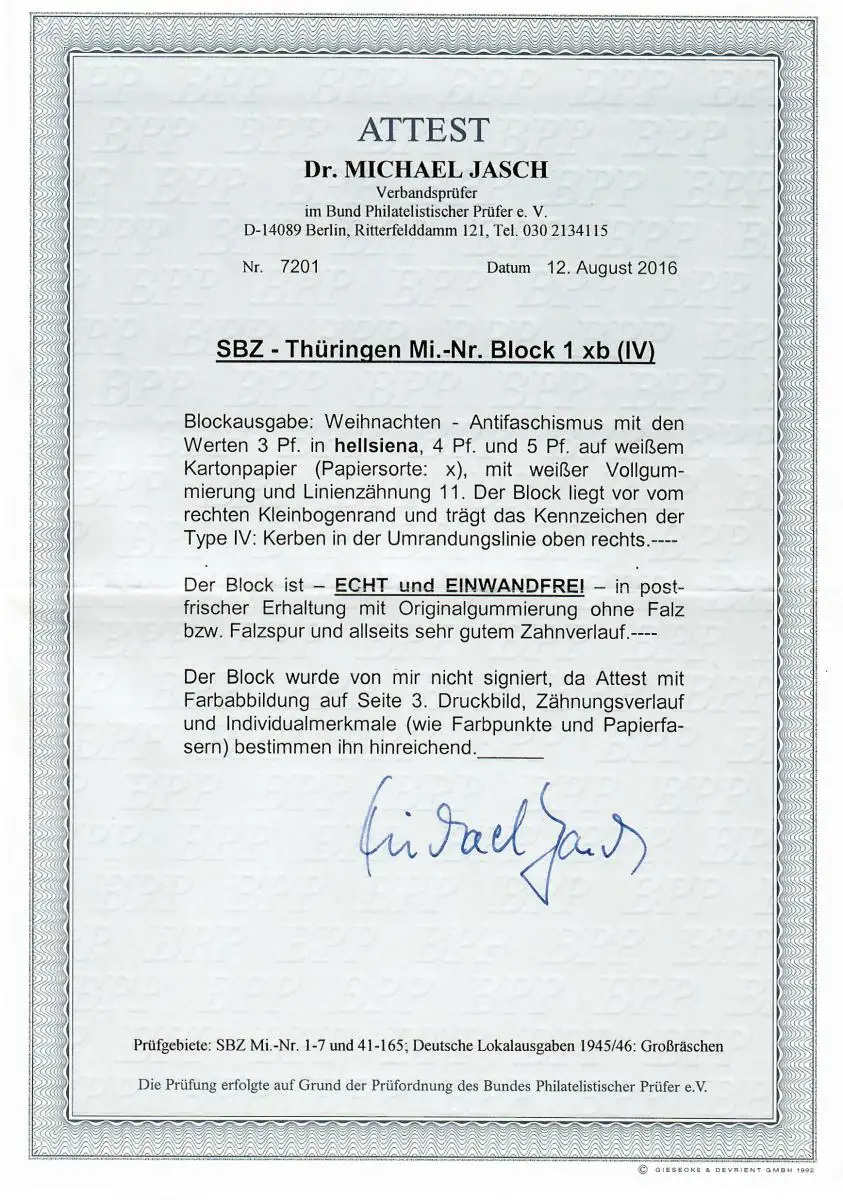 SBZ: MiNr. Block 1xb (IV), postfrisch, **, BPP Attest
