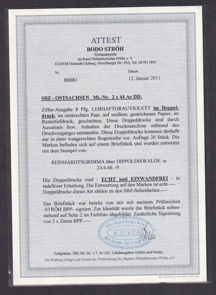 SBZ- Ostsachsen Mi.-Nr. 2 x 44 Ac DD, FA. StröhBPP.