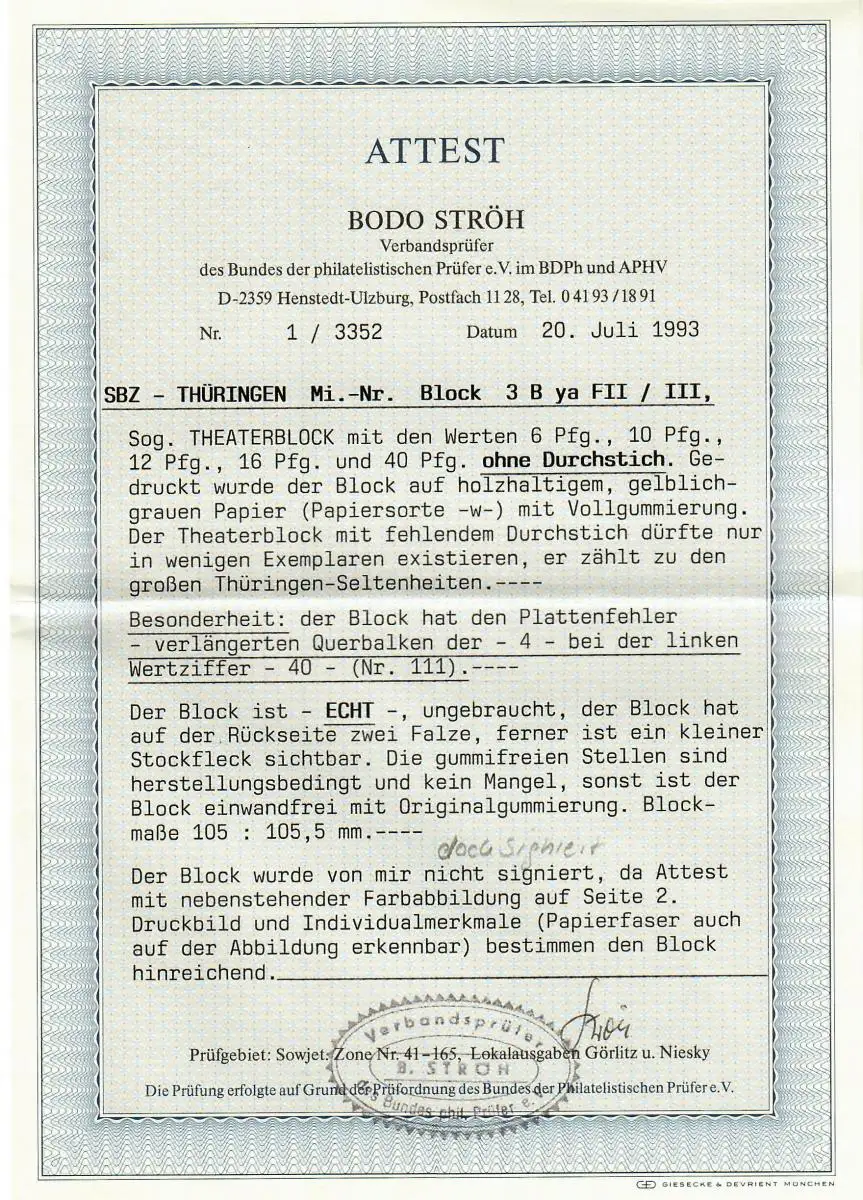 SBZ Thüringen MiNr. Block 3 B ya FII/III, Plattenfehler, *, BPP Attest